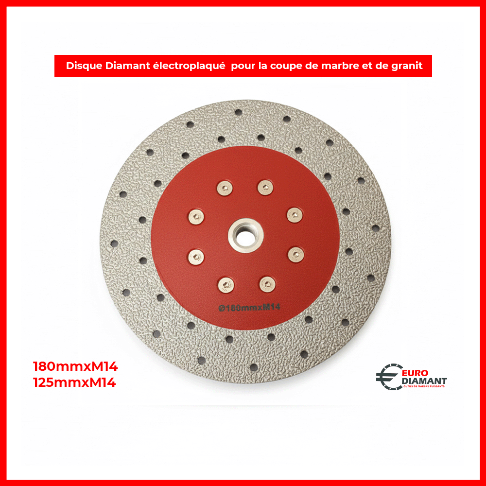 Ce disque diamant 180mm d’Euro Diamant est l’outil professionnel parfait lorsque vous alternez entre la coupe marbre (pierre tendre) et la coupe granite (pierre dure). Le revêtement électroplaqué (doré) assure une concentration de diamant très élevée sur la jante, offrant une coupe agressive et un façonnage efficace.